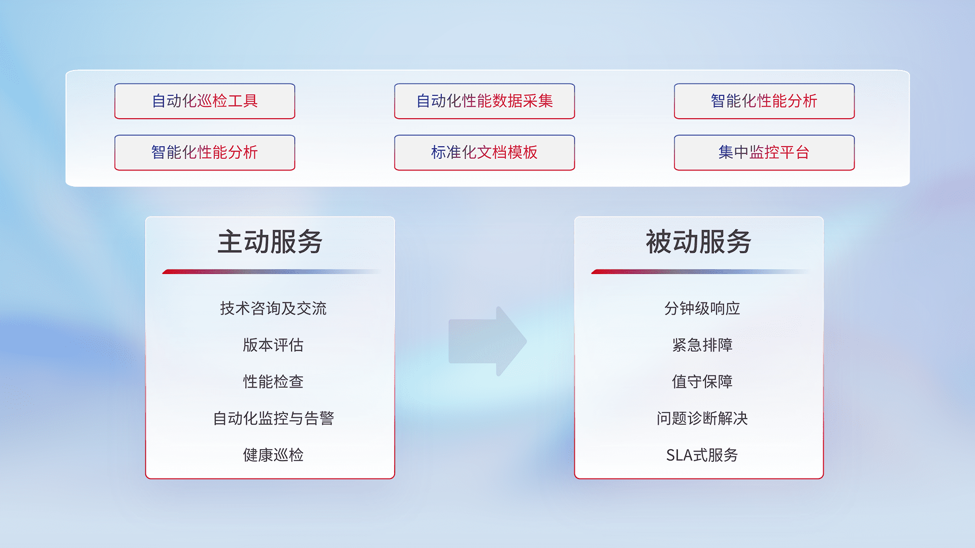 智能化工具和标准化文档,,,,保障服务质量,,,,提供主动服务(包含技术咨询、、版本评估、、、性能检查、、自动化监控与告警、、、、健康巡检)和被动服务包含(分钟级响应、、、紧急排障、、值守保障、、、问题诊断解决、、、SLA服务)。。。