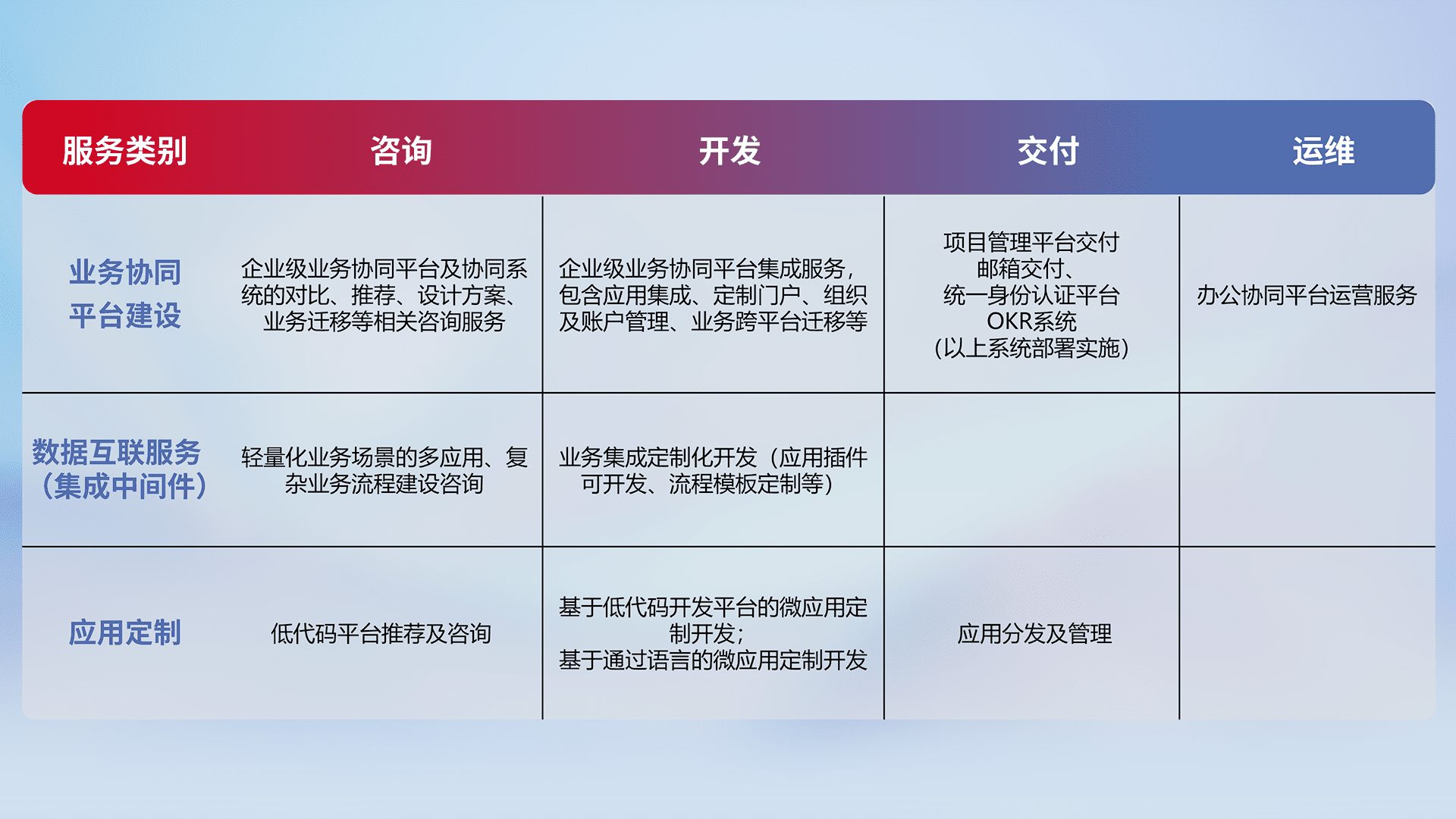 针对钉钉、、、企微、、IDaas等平台级产品提供产品的规划、、、方案、、交付、、定制化开发等服务,,实现如统一协同办公、、、智能客户服务、、、混合会议管理、、、、智能数据查询、、、等业务场景,,,,实现数字化转型。。